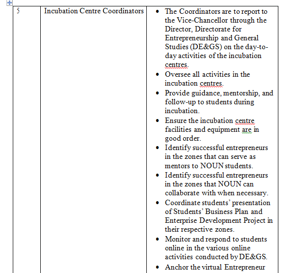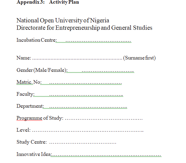 examination and are given opportunity to present their innovative idea along with their business plan. It is at the presentation point that students with creative and innovative ideas are discovered. These group of students are automatically enrolled into NOUN Incubation Centres. Those with business mind receive start-ups support while the non-business minds are released to use the entrepreneurial skills gained in their daily endeavours. Not everyone can be an entrepreneur, but to drive the economy, you need an entrepreneur.