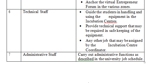 1. A minimum of two technical staff who must proficiency in managing the equipment in the incubation centre