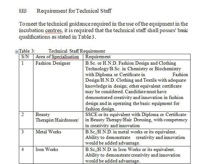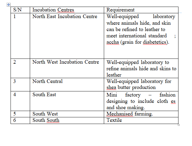 These are provided according to need and available resources where the incubation centres are. For instance, Bauchi shall have two Laboratories for Mineral and Agro Research.