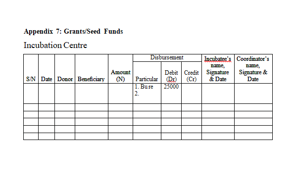 . There must be proper documentation of all incomes and spending at the Incubation Centre. An accountant from Bursary shall be in charge but where not available the Coordinator has to do it.